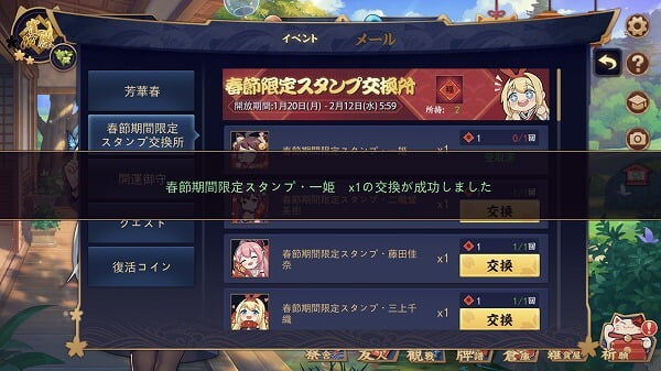 注意点としては、春節期間限定スタンプは所持していない雀士キャラクターのものも交換することはできますが、その場合は使用することはできません。また、使用期限があり2020年2月29日(土)5時59分までしか使うことができないことにも注意しましょう。