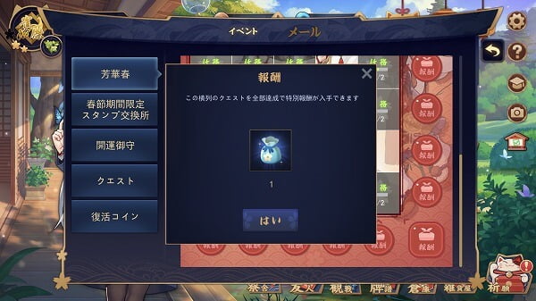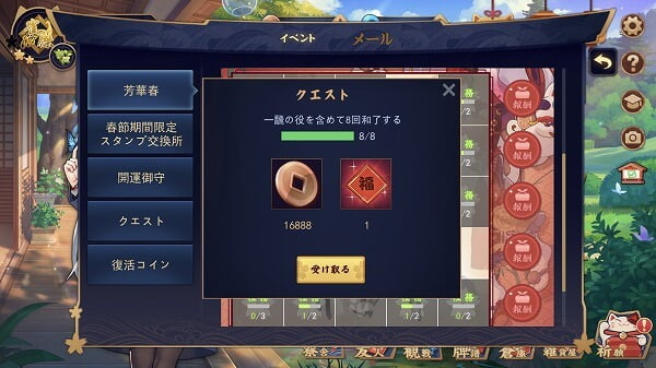 さらに、縦・横列のクエストを全て達成すると、列毎に特別な報酬が入手できます。イベントアイテム「福の紙」を、春節期間限定スタンプと交換することができます。