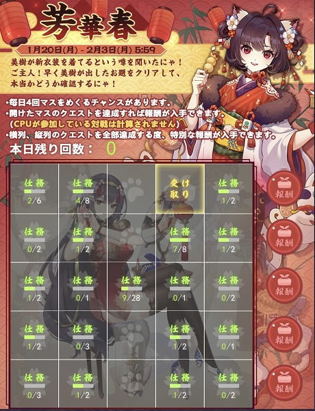 イベント期間中は毎日4回マスをめくるチャンスがあり、めくったマスのクエストを達成すると、そのマスの報酬が入手できます。