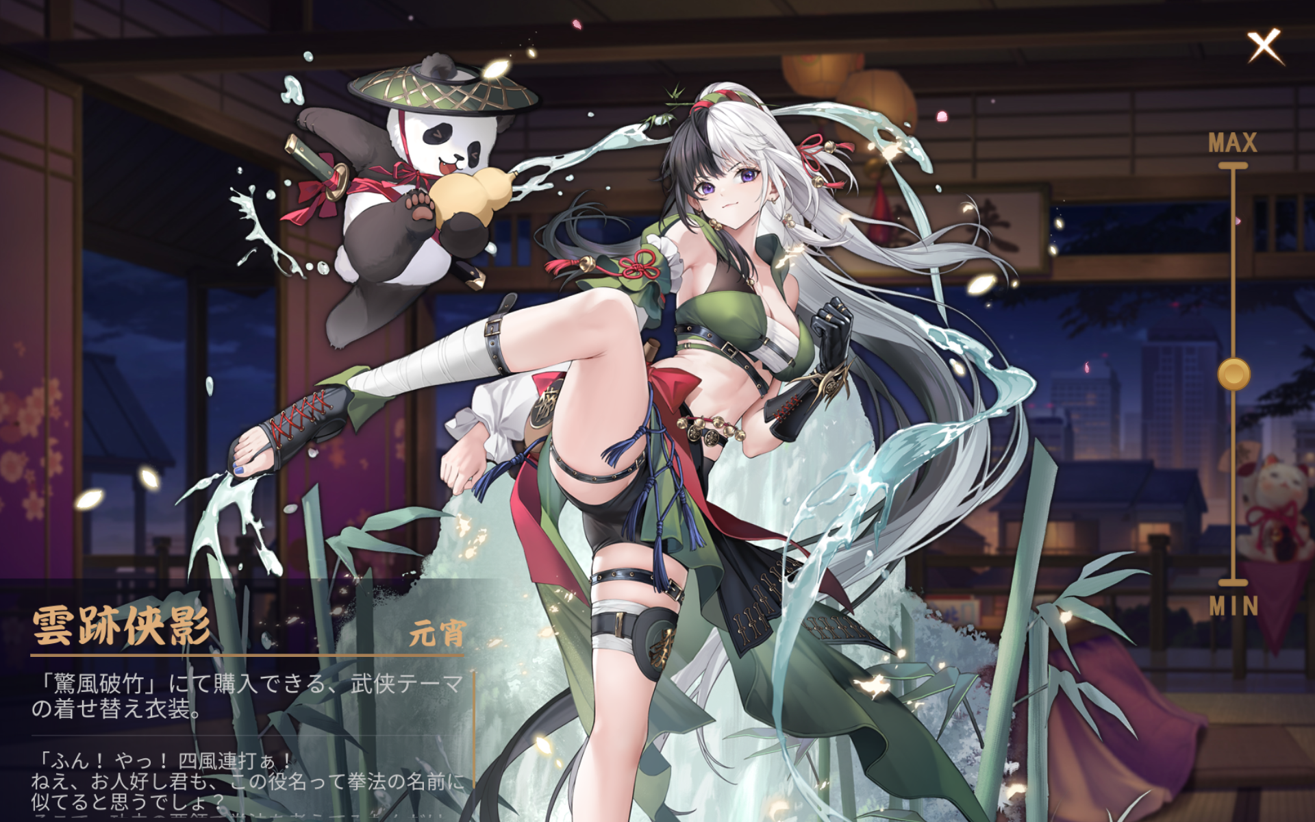 キャラ説明 | 「僕は元宵(ユエンシャオ)。最近一飜市に引っ越してきたんだ。」 明るく活発なカンフー少女。対局中、緑一色を狙えそうな時は それしか考えない。彼女の故郷ではパンダを飼うのが一般的で、彼女も「火鍋 (ホォグォ)」という名前のパンダを連れている。あらゆる辛い食べ物を愛し、辛さへの耐性が尋常じゃないので、彼女がおすすめする辛さは一般人にはおすすめしない。 |