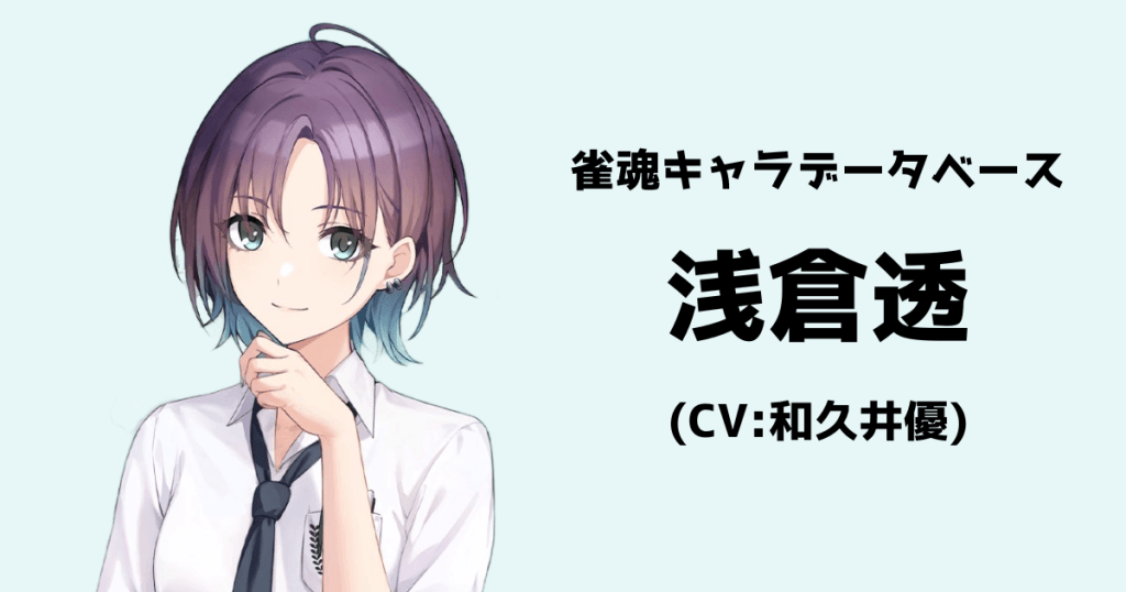 オンライン麻雀ゲーム『雀魂(じゃんたま)』の雀士キャラクター「浅倉透(CV:和久井優)」についてのデータをまとめたページです。 浅倉透の基本情報 名前浅倉透なまえあさくらとおるCV和久井優キャラ説明「浅倉 透。よろしく、同じ旅人として。」自然体... -
